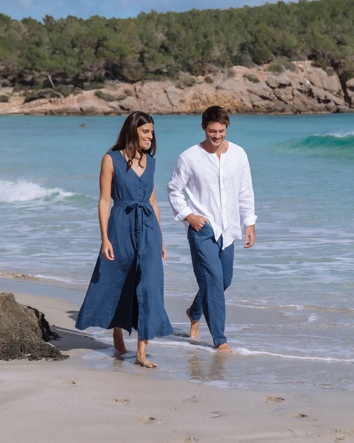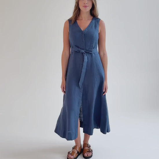 Effortless elegance, tailored to your rhythm. This sleeveless linen midi dress features a fluid A-line cut, button-down front, and self-tie belt for adjustable shaping. Crafted in breathable Egyptian flax, it's a soft statement of summer simplicity and movement.