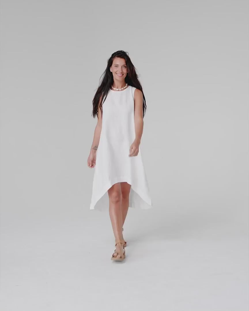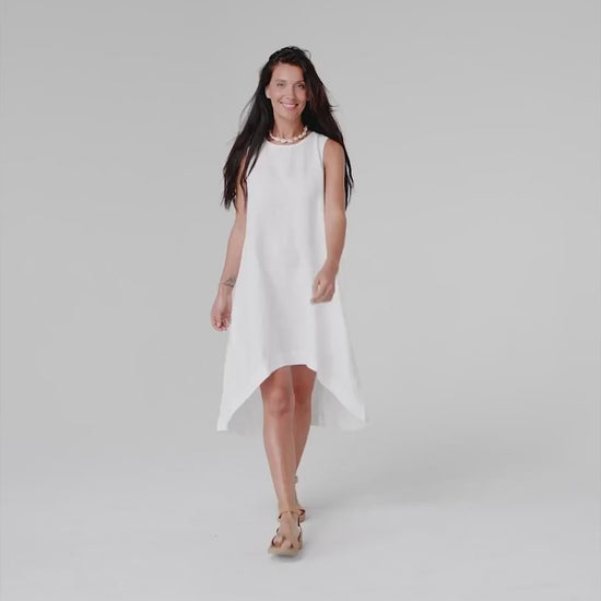White Linen High-Low Dress – Sleeveless with Coconut Button